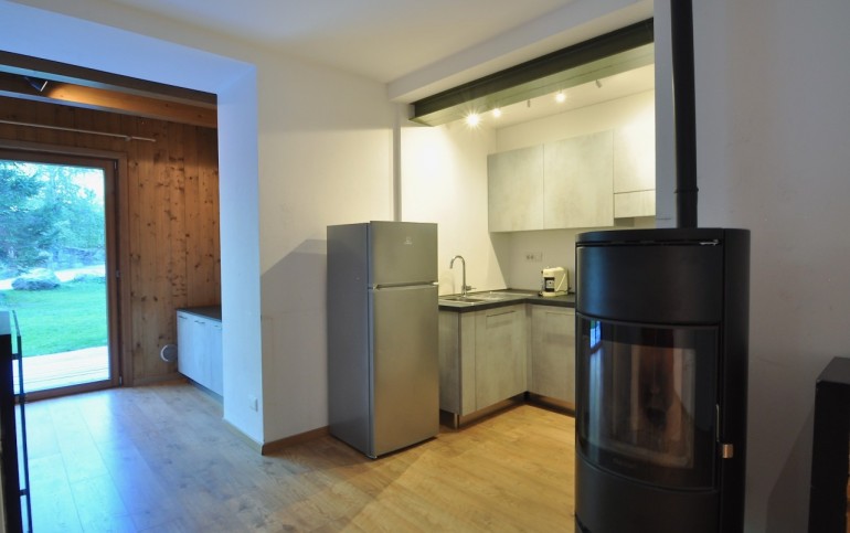 - soggiorno con cucina a vista completa di elettrodomestici,